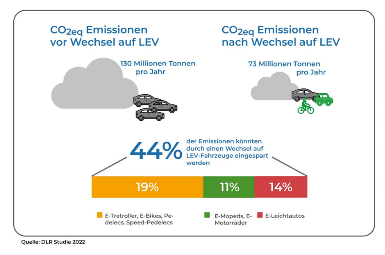 Würden also 76% der gefahrenen Strecken mit einem LEV zurückgelegt, dann könnten 44% der Emissionen im Verkehrssektor eingespart werden. Das entspricht 57 Millionen Tonnen CO2eq pro Jahr.