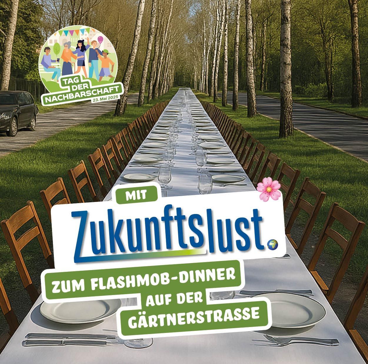 Anlässlich des "Tag der Nachbarschaft" organisiert die Kiezinitiative ZUKUNFTSLUST am 23. Mai ein Flashmob-Dinner auf der Gärtnerstraße in Berlin-Lichterfelde.