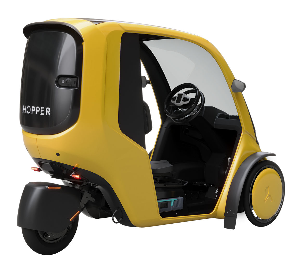 Der Hopper ist mein Liebling, denn bei diesem innovativen Vehikel handelt es sich um ein Fahrrad. -Ja, richtig gehört. Ein Pedelec mit Dach, Scheinwerfern, Rückspiegeln, Scheibenwischer und einknöpfbaren Türen für den Winter.