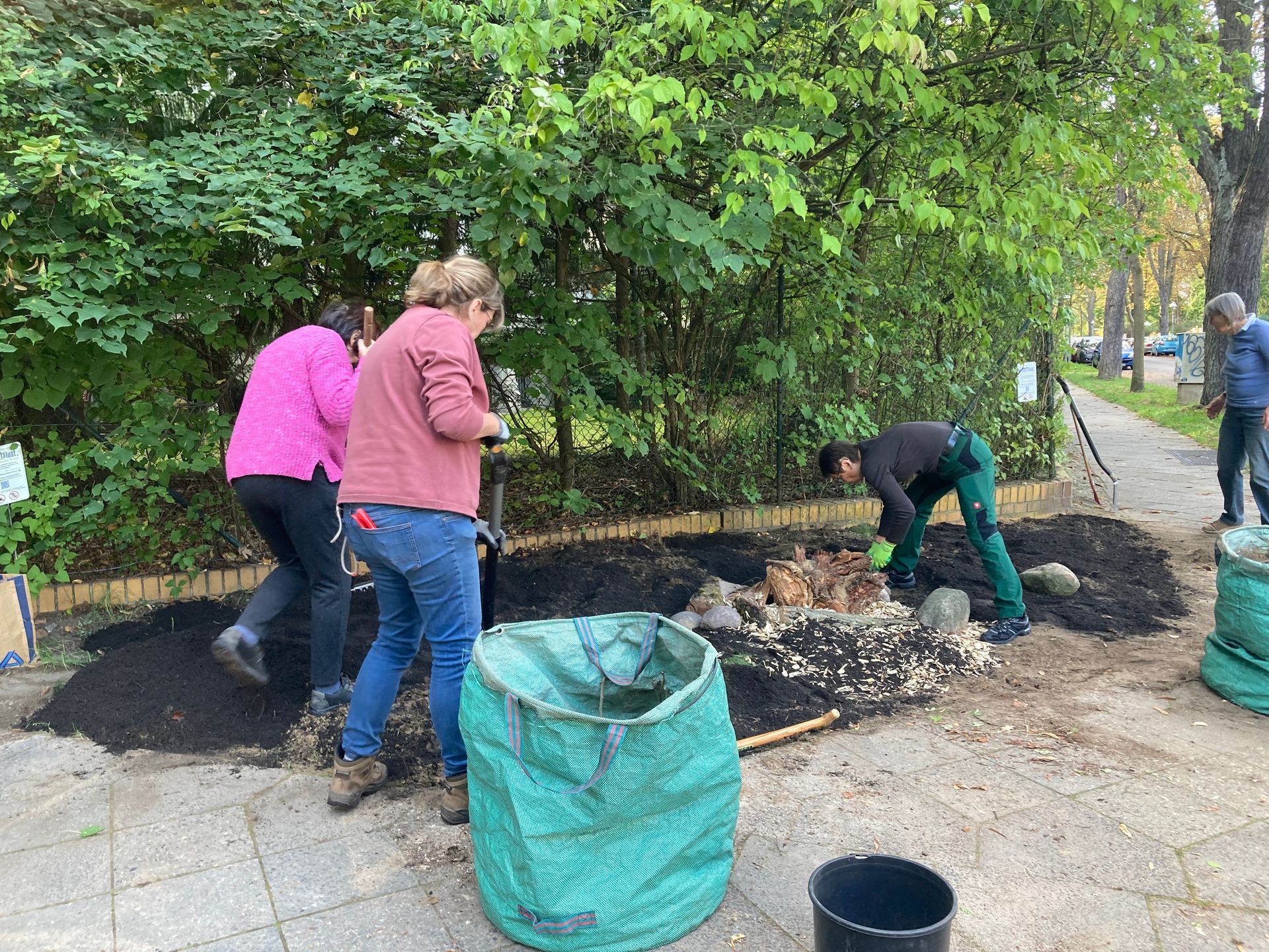 Wir haben zunächst die Schwingel-Gräser ausgepflanzt und begonnen die Fläche umzugraben. Dabei wurden Wurzelunkräuter und Wurzeln von Sträuchern entfernt. Damit die Wildpflanzen einen guten Start haben, der Boden seine Wasserkapazität verbessern kann und im gestressten Stadtboden wieder mehr Microorganismen leben können, haben wir frischen Grünschnittkompost in den vorhandenen Boden eingearbeitet. Damit der Boden sich später nicht zu sehr setzt haben wir die Fläche mit unseren Füßen angetreten.