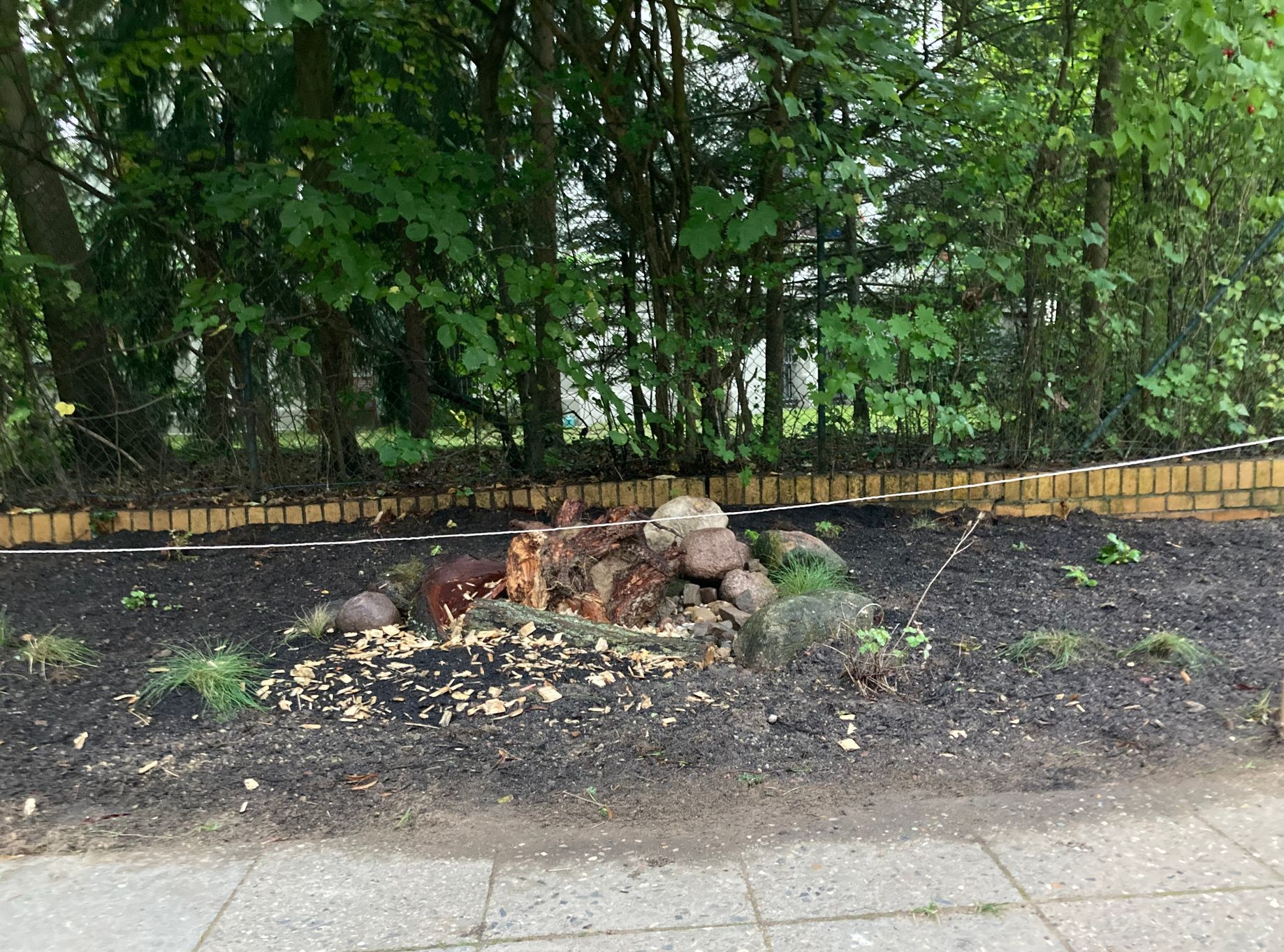 Als Expertin für naturnahes Grün, Wildpflanzen und naturnahe Bautechnik hatte ich die Fläche vorher in Augenschein genommen. Der alte Baumstumpf, bereits besiedelt mit holzzersetzenden Pilzen, Mikroorganismen und anderen wertvollen Lebewesen wie z. B. Asseln, bot die perfekte Grundlage für weitere Strukturen, die wir im Habitat angelegt haben.