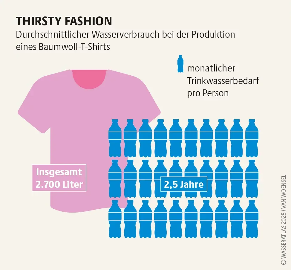 Für die Herstellung von Lebensmitteln, Bekleidung und anderen Bedarfsgütern wird dagegen so viel Wasser verwendet, dass es 7.200 Litern pro Person und Tag entspricht. Ein Großteil dieses indirekt genutzten Wassers wird für die Bewässerung von Obst, Gemüse, Nüssen, Getreide und Baumwolle benötigt.